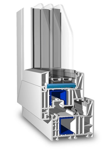 Profil bluEvolution - 82 mm 6-komorowe profile ram i skrzydeł wykonane z najwyższej jakości PCV głębokość zabudowy 82 mm z możliwością wkładu 3 szybowego oraz środkową dodatkową uszczelką o łącznej przenikalności ok. Uw =0,7 W/m²K